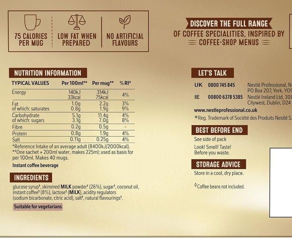 Instant coffee with whitener and sugar. Deliciously creamy tasting with hidden depths of full bodied coffee.